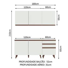 As medidas totais são: 180 cm de largura e 83 cm de altura nos balcões e 66 cm de altura nos aéreos. A altura final pode ser definida pelo cliente na hora da instalação, colocando o aéreo na altura que desejar. Na imagem sugerimos a altura padrão da linha Reims: 210 cm.