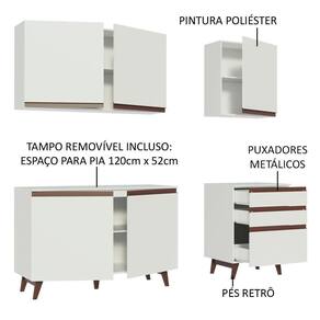 Sua profundidade é de cozinha planejada: 52 cm nos balcões e 31 cm nos armários aéreos. Ambos os balcões acompanham tampo, e o maior pode ser removido para colocação de pia de inox ou pedra. Para completar, os pés em madeira são um charme a parte que além de beleza, conferem firmeza e resistência ao móvel.