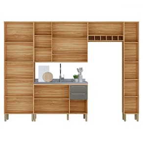 Armário de Cozinha com Balcão para Pia 13 Portas 2 Gavetas Xangai 100% Mdf Vidro Reflecta Amêndoa/Cinza - Pnr Móveis