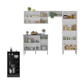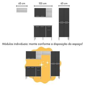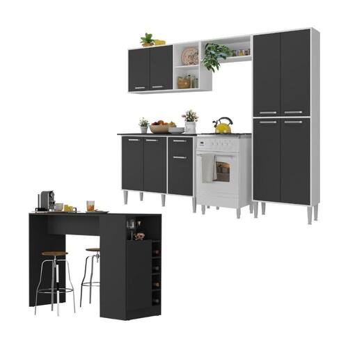 Armário De Cozinha Com Bancada Americana Xangai Multimóveis Mp2203 Branco/preto Branco/preto Produzido em MDP com acabamento acetinado (cerca de 20% de brilho), o Armário de Cozinha com Bancada Americana Xangai Multimóveis MP2203 garante durabilidade e facilidade na limpeza. Com amplo espaço interno para organização, a cozinha possui 9 portas embutidas, prateleiras e 1 gaveta com corrediças telescópicas em aço (deslizamento suave, silencioso e maior segurança no manuseio), além de compartimento especial para utensílios mais altos, espaço para fogão ou geladeira e nicho horizontal. O balcão (suporta até 15kg) e a bancada (suporta até 20kg) possuem tampos de 15mm resistentes. Os puxadores em ABS com acabamento cromado complementam o design moderno e funcional do produto. Os pés em polipropileno com regulagem de altura possibilitam um perfeito nivelamento dos módulos, enquanto o balcão possui tampo removível (compatível com pia sob medida). Versátil, a cozinha compacta é dividida em módulos separados, permitindo a montagem da maneira que melhor se encaixar no ambiente. A bancada inclusa conta com 1 porta, prateleira interna e adega embutida, oferecendo espaço adicional para armazenamento e praticidade na hora de servir bebidas, além de poder ser utilizada como divisora de ambientes. Este conjunto alia funcionalidade e elegância, proporcionando uma solução completa para a organização e decoração da sua cozinha! Conteúdo da Embalagem: 1 (um) Nicho Horizontal 63cm 1 (um) Armário Aéreo 105cm 1 (um) Paneleiro Duplo 63cm 1 (um) Balcão com Tampo 105cm 1 (uma) Bancada/Mesa Manual de Montagem Kit Ferragem