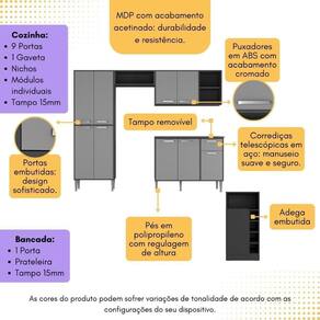 Produzido em MDP com acabamento acetinado (cerca de 20% de brilho), o Armário de Cozinha com Bancada Americana Xangai Multimóveis MP2203 garante durabilidade e facilidade na limpeza. Com amplo espaço interno para organização, a cozinha possui 9 portas embutidas, prateleiras e 1 gaveta com corrediças telescópicas em aço (deslizamento suave, silencioso e maior segurança no manuseio), além de compartimento especial para utensílios mais altos, espaço para fogão ou geladeira e nicho horizontal. O balcão (suporta até 15kg) e a bancada (suporta até 20kg) possuem tampos de 15mm resistentes. Os puxadores em ABS com acabamento cromado complementam o design moderno e funcional do produto. Os pés em polipropileno com regulagem de altura possibilitam um perfeito nivelamento dos módulos, enquanto o balcão possui tampo removível (compatível com pia sob medida). Versátil, a cozinha compacta é dividida em módulos separados, permitindo a montagem da maneira que melhor se encaixar no ambiente. A bancada inclusa conta com 1 porta, prateleira interna e adega embutida, oferecendo espaço adicional para armazenamento e praticidade na hora de servir bebidas, além de poder ser utilizada como divisora de ambientes. Este conjunto alia funcionalidade e elegância, proporcionando uma solução completa para a organização e decoração da sua cozinha!