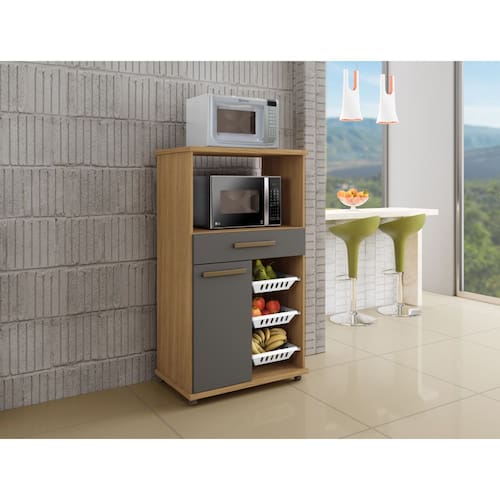 Unindo praticidade e funcionalidade a Fruteira Fortaleza era o que faltava em sua cozinha. Seu balcão com 2 tampos resistente é perfeito para micro-ondas ou forno elétrico. Possui também um a gaveta ampla com corrediça telescópica, uma prateleira interna removível e fruteiras em plastico. \nEspecificações Produto Montado: Altura: 127 cm Largura: 73 cm Profundidade: 45 cm Quantidade de Volumes: 1 Peso:38kg\nGarantia: 3 Meses Número de Portas: 01 Número de Prateleiras: 01 Número de Gavetas: 01 Número de Cestos: 03 Possui vidro: Não Possui rodízio: Sim\nObservações: Não oferecemos serviço de montagem, mas todos os produtos possuem manual de montagem com o passo a passo. Recomendamos contratar um profissional de montagem. Pode existir alguma diferença de tonalidade entre a foto e o produto, devido ao tratamento de imagens e à calibração de cores do monitor