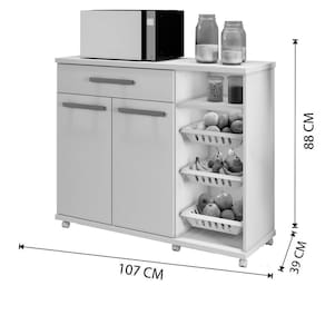 Com designer sofisticado a Fruteira Salinas é ideal para armazenamento de frutas e legumes, possui também rodízios para facilitar a movimentação. Simples e fácil de limpar suas fruteiras são removíveis. Móvel ideal para quem quer manter sua cozinha mais organizada.\nEspecificações do Produto Montado: Altura: 88 cm Largura: 107 cm Profundidade: 39 cm Peso: 36Kg Quantidade de Volume: 1\nGarantia: 3 Meses Número de Portas: 02 Número de Prateleiras: 01 Número de Gavetas: 01 Número de Cestos: 03 Possui vidro: Não Possui rodízio: Sim Necessita de montagem? Sim, sugerimos a contratação de algum profissional experiente de sua preferência Recomendações de limpeza e manutenção: Limpar com pano umedecido, não aplicar produtos químicos.\nObservações: Não oferecemos serviço de montagem, mas todos os produtos possuem manual de montagem com o passo a passo. Recomendamos contratar um profissional de montagem. Pode existir alguma diferença de tonalidade entre a foto e o produto, devido ao tratamento de imagens e à calibração de cores do monitor