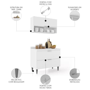 O Armário Aéreo conta com uma porta basculante com pistão a gás e dois nichos, para auxiliar na organização dos seus utensílios de forma prática e eficiente. Enquanto o Balcão Gabinete dispõe de duas portas basculantes com fecho trava de segurança, que permite o fechamento com um simples toque. Ambos possuem estrutura em MDP 15mm, com acabamento em BP, puxadores em alumínio e dobradiças metálicas, que garantem máxima resistência no uso diário. O tampo serve como apoio para eletrodomésticos ou no preparo dos alimentos, e o rodatampo que é um excelente acabamento entre o balcão e a parede. Os pés em PVC, são reguláveis, permitindo ajustar pequenos desníveis de piso. Este Armário de Cozinha é a solução ideal para otimizar sua casa, combinando materiais de alta qualidade com um design sofisticado.