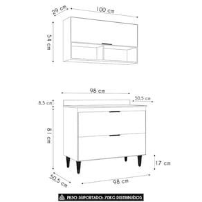 Peso Suportado Distribuído: Balcão 30 Kg / Armário 20 Kg / Tampo: 20 Kg.
