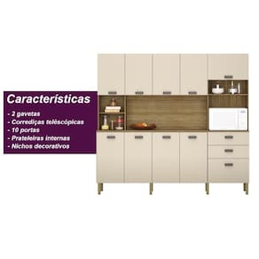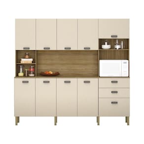 Material: MDP | Cor: Freijó/Supremo | Cômodo Indicado: Cozinha | Dimensões do Produto (A X L X P): 204 x 222 x 46,8 | Possui Prateleira: Sim | Possui Gaveta: Sim | Tipo da Corrediça da Gaveta: Telescópicas | Possui portas: Sim | Quantidade de portas: 10 Portas | Tipo de Porta: Bater | Possui porta Basculante: Não | Possui Pistão á Gás: Não | Possui Nichos: Sim | Possui pés: Sim | Possui Vidro: Não | Quantidade de Vidros: 0 | Peso do Produto (Kg): 100.55 | Altura do Produto (cm): 204 | Largura do Produto (cm): 222 | Comprimento do Produto (cm): 46.8 | Nome do Simples no Fornecedor: Intense | Garantia do Fabricante: 90 dias | Instruções/Cuidados: Evite contato com líquidos. Nada de lavar os móveis. Móveis não gostam de umidade. Não deixe o móvel exposto ao sol. Os acessórios também precisam de limpeza. | Produto precisa de Montagem?: Sim, a montagem é simples mas sugerimos a contratação de algum profissional experiente de sua preferência | Material para Filtro: MDP | Material da Estrutura: MDP | Necessita Fixação na Parede: Não | Conteúdo Embalagem: Cozinha Compacta Ferrara | Origem: Nacional | Estado de Origem: Paraná | Quantidade de Volumes: 3 | Peso Bruto (volume 01): 42,5 KG | Comprimento x Largura x Altura (volume 01): 166 x 47 x 11 | Peso Bruto (volume 02): 37,2 KG | Comprimento x Largura x Altura (volume 02): 166 x 74 x 5 | Peso Bruto (volume 03): 24,4 KG | Comprimento x Largura x Altura (volume 03): 116 x 75 x 5 Cor: Freijó/Vanilla