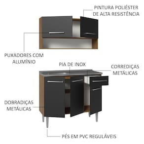 A cozinha é fabricada com materiais de ótima qualidade, garantindo resistência e robustez. Possui dobradiças e corrediças metálicas, puxadores com alumínio e pés em PVC com regulagem para pequenos desníveis no piso.