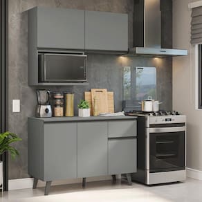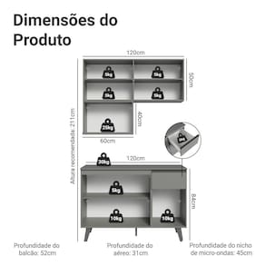 - 52 cm de profundidade no balcão, 31 cm no aéreo e 45 cm no nicho de micro-ondas