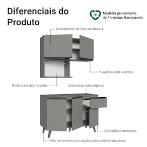 Produzido com materiais de qualidade, o balcão possui dobradiças metálicas nas portas e puxadores em perfil de alumínio, garantindo resistência. As gavetas possuem corrediças que permitem abertura total, oferecendo mais praticidade. O tampo é removível, possibilitando a instalação de cuba ou pedra e o acabamento é de alta resistência, garantindo durabilidade no uso diário.