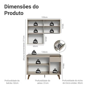 - 52 cm de profundidade no balcão, 31 cm no aéreo e 45 cm no nicho de micro-ondas
