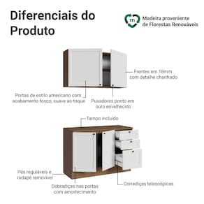 O acabamento de alta resistência da estrutura é em tom amadeirado Rustic, das frentes em Branco e possui uma textura suave ao toque. O destaque fica por conta dos puxadores ponto em ouro envelhecido, feitos com metal resistente, trazem personalidade e um charme único. Outro diferencial está no detalhe chanfrado das frentes, que forma molduras elegantes e dá profundidade ao design.