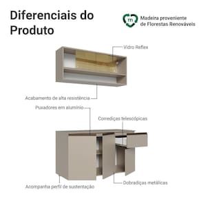 Produzido com materiais de qualidade, o balcão conta com dobradiças metálicas nas portas e puxadores em perfil de alumínio, discretos e resistentes. O tampo é removível, o que permite a instalação de cuba ou pedra. O acabamento é de alta resistência, garantindo durabilidade no uso diário.