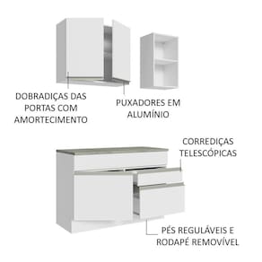 Outro diferencial é a fabricação com materiais de qualidade, como as corrediças telescópicas, os puxadores com perfil total em alumínio e as dobradiças com amortecimento para fechamento suave das portas. Além disso, os pés são reguláveis em PVC e o rodapé removível em MDP.