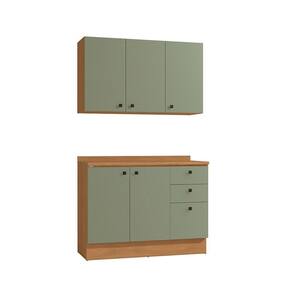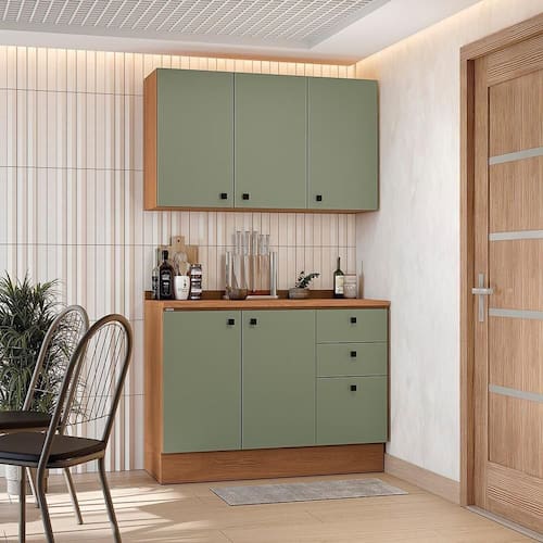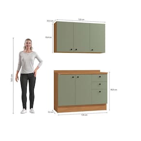 Já as frentes, na cor verde frevo, contam com acabamento fosco em BP, proporcionando maior durablidade contra riscos, arranhões e gotas d'água. Uma combinação aconchegante e moderna, remetendo aos tons da natureza e deixando seu ambiente lindo, incluindo facilidade durante a limpeza. Perfeito para ambientes compactos, o conjunto conta com 120cm de largura e 2,20m de altura, sendo compacto e funcional, une o balcão e áereo de pia, indispensáveis em todas as composições.