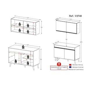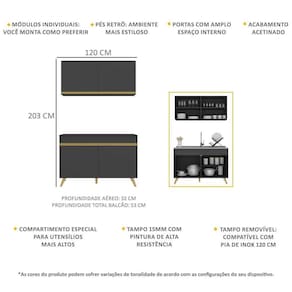 Dimensões do produto montado: Altura: 203cm | Largura: 120cm | Profundidade: 32cm (aéreos) - 53cm (balcão com tampo) *Você pode consultar as medidas internas na imagem técnica do produto.