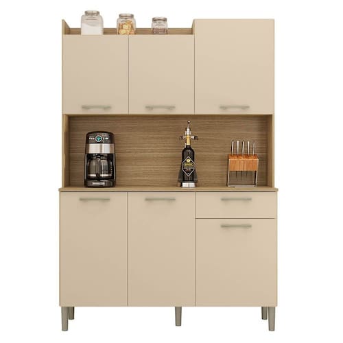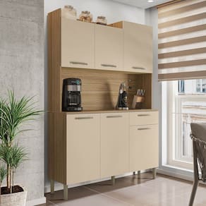Essa Cozinha vai ser ótima para te auxiliar no preparo das refeições, contém 6 portas com duas prateleiras, bancada para apoio de eletro portáteis, uma gaveta para talheres ou utensílios pequenos, e também, na parte superior uma prateleira para vasos, baleiro ou outros objetos de decoração. Para garantir a qualidade e durabilidade deste lindo Armário de Cozinha, a produção é em MDP e acabamento em pintura com secagem em luzes UV, acabamento fosco e textura sensível ao toque, nas portas e gaveta são utilizadas corrediças e dobradiças 100% metálicas para garantir a suavidade e segurança no abrir e fechar!