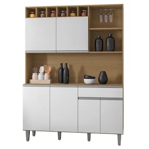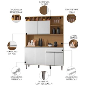 A funcionalidade desse Armário de Cozinha é outro ponto de destaque. Conta com seis portas convencionais, com dobradiças metálicas, para armazenamento de utensílios, panelas e outros itens essenciais. Além disso, possui uma gaveta ideal para guardar utensílios menores. A prateleira e os nichos são perfeitos para organizar objetos decorativos ou utensílios de uso diário, mantendo a cozinha sempre organizada e ao alcance das mãos.