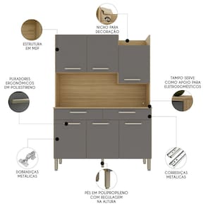 É fabricado em MDF 12mm com acabamento em pintura UV, garantindo máxima resistência para o uso diário. As dobradiças e corrediças metálicas proporcionam uma abertura e fechamento suave, enquanto os puxadores ergonômicos em poliestireno, conferem um toque de sofisticação ao Armário de Cozinha.