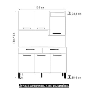 Com seis portas convencionais, duas gavetas centrais e duas prateleiras internas, a Cozinha Compacta oferece amplo espaço de armazenamento para acomodar utensílios, louças e mantimentos. O Nicho superior é um destaque à parte, perfeito para expor itens decorativos, e o tampo serve como apoio para eletrodomésticos, trazendo mais praticidade ao ambiente. O passa fio permite esconder os cabos, mantendo um visual clean e organizado. Além disso, os pés em polipropileno são reguláveis, o que possibilita ajustar pequenos desníveis de piso e manter a estabilidade do Armário de Cozinha Simples.