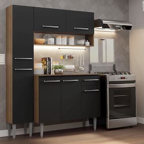 Esta composição inclui um paneleiro com duas portas, um balcão com três portas e uma gaveta, um aéreo com duas portas e um nicho aberto, oferecendo amplos espaços para armazenamento e organização. O acabamento em tom amadeirado Rustic e Preto cria um visual moderno para a sua cozinha.