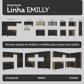 A linha Emilly se destaca pelo acabamento de alta resistência, puxadores em alumínio e a utilização de corrediças e dobradiças metálicas, garantindo durabilidade. Os pés reguláveis proporcionam maior estabilidade e facilitam a limpeza do ambiente, tornando o dia a dia mais prático.