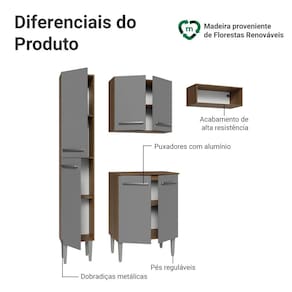 A linha Emilly possui acabamento de alta resistência e puxadores em alumínio. Possui corrediças e dobradiças metálicas, garantindo durabilidade no dia a dia. Os pés reguláveis em PVC proporcionam estabilidade e facilitam a limpeza do ambiente.