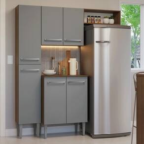 Esta versão inclui um paneleiro com duas portas, um balcão com duas portas e tampo, um aéreo com duas portas e um nicho aberto, ideal para posicionar a geladeira logo abaixo. O acabamento em tom amadeirado Rustic e Cinza valoriza o ambiente com um toque atemporal e cheio de personalidade.