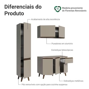 Produzido com materiais de qualidade, o balcão conta com dobradiças metálicas nas portas e puxadores em perfil de alumínio, discretos e resistentes. As gavetas possuem corrediças que permitem abertura total. O tampo é removível, possibilitando a instalação de cuba ou pedra e o acabamento de alta resistência mantém a beleza do móvel por muito mais tempo.