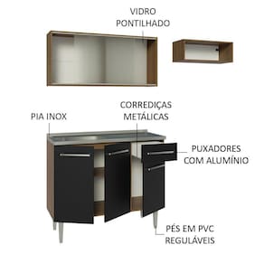 Super moderna, esta cozinha é resistente e durável, composta por materiais de alta qualidade. Conta com dobradiças e corrediças metálicas, puxadores com alumínio e pés em PVC, com regulagem para pequenos desníveis no piso.