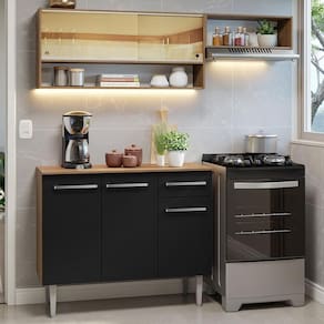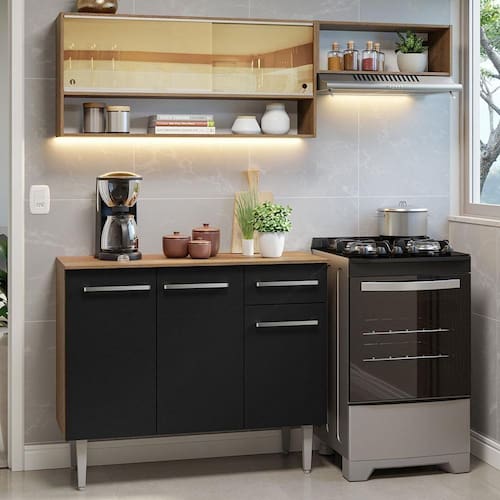 Para completar, o acabamento desta cozinha compacta combina os tons preto e amadeirado Rustic. É feito em Pintura Poliéster ecológica, criando um visual elegante e atemporal.