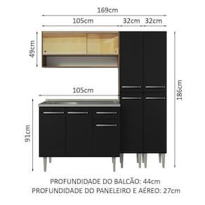 - 44 cm de profundidade no balcão e 27 cm de profundidade no aéreo e nos paneleiros