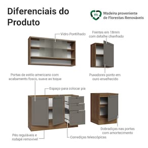 O acabamento de alta resistência da estrutura é em tom amadeirado Rustic, das frentes em Cinza e possui uma textura suave ao toque. O destaque fica por conta dos puxadores ponto em ouro envelhecido, feitos com metal resistente, trazem personalidade e um charme único. Outro diferencial está no detalhe chanfrado das frentes, que forma molduras elegantes e dá profundidade ao design.
