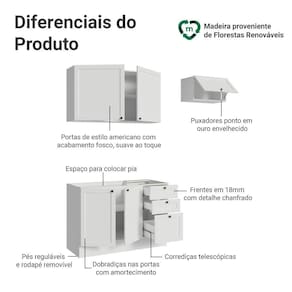 Os armários e balcões foram cuidadosamente projetados para aproveitar ao máximo o espaço, o balcão de pia, permite a instalação de pia de inox ou pedra. Além disso, o aéreo com porta basculante possui um sistema de pistão a gás que permanece a porta suspensa quando aberta, proporcionando mais praticidade e no uso diário.