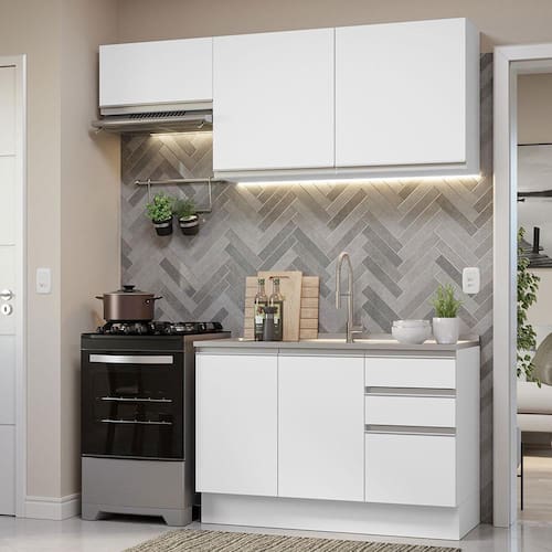 Para completar, o acabamento da cozinha é branco, feito em Pintura Poliéster com 7 camadas que protegem o móvel dos efeitos da água e do calor.