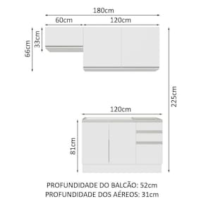 Além do bom espaço para utensílios e alimentos, este armário é composto por módulos avulsos e bem divididos. Também é possível instalar pia de inox ou pedra no balcão, na medida de 120 x 52 cm.