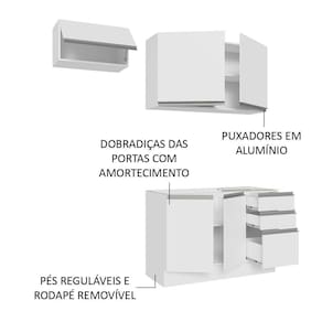 O móvel conta com puxadores em alumínio, amortecedores para fechamento suave das portas e corrediças telescópicas que permitem a abertura total das gavetas. Além disso, possui pés reguláveis em PVC e rodapé removível em MDP.