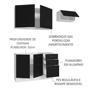 O balcão de pia tem dimensões de 120 x 52 cm e é possível fazer a instalação de uma pia de inox ou pedra. Para completar, os pés são reguláveis em PVC e o rodapé removível em MDP, detalhes que facilitam a limpeza.