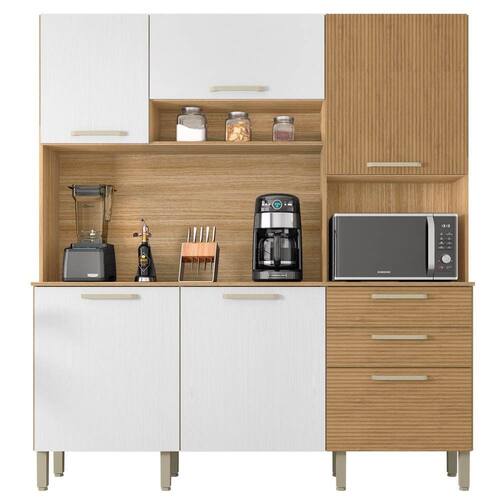 Esta Cozinha é perfeita para quem quer praticidade e organização na hora de cozinhar. Com ela, você tem espaço para guardar todos os seus utensílios, panelas, louças e mantimentos. E ainda conta com um nicho para colocar o seu micro-ondas, forno elétrico ou eletroportáteis, e também nicho para decoração. E o melhor de tudo: ela tem 8 pés que garantem a estabilidade e a durabilidade do móvel, é uma Cozinha Compacta e com a qualidade que você precisa para o dia a dia. Para um design mais moderno, detalhe ripado em impressão UV nas gavetas e em 2 portas.