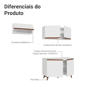 A cozinha é composta por três módulos avulsos e adaptáveis ao seu espaço. Além disso, é ampla e permite que você organize todos os seus utensílios e louças. O balcão ainda conta com tampo em MDP, que pode ser removido para instalação de pia de inox ou pedra de 120 x 52 cm.