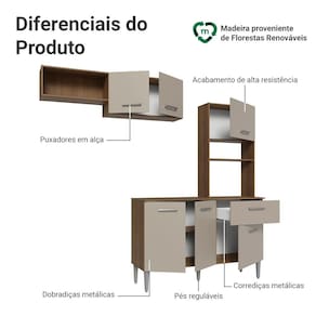 Fabricada com materiais de alta resistência, conta com dobradiças e corrediças metálicas, puxadores em alça e pés ajustáveis, garantindo durabilidade. O acabamento da estrutura é em tom amadeirado Rustic e das frentes em Crema. A Cozinha Aura é a solução perfeita para quem busca aproveitamento de espaço.