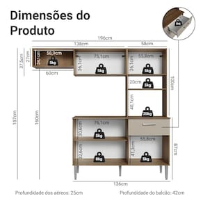 Além dos armários aéreos e balcão para utensílios, a composição conta com espaço para acomodar fogão e micro-ondas, garantindo praticidade no preparo das refeições e deixando sua cozinha ainda mais funcional.