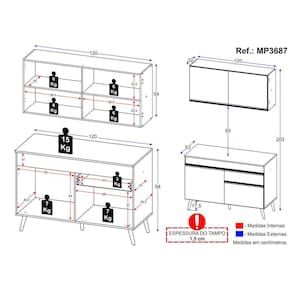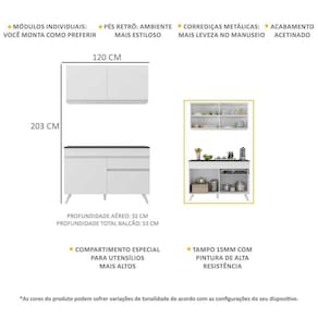 Dimensões do produto montado: Altura: 203cm | Largura: 120cm | Profundidade: 32cm (aéreos) - 53cm (balcão com tampo) *Você pode consultar as medidas internas na imagem técnica do produto.
