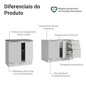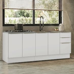 A composição reúne módulos que otimizam a organização e facilitam a rotina no dia a dia. O gabinete de pia não inclui tampo, permitindo que você escolha o acabamento.