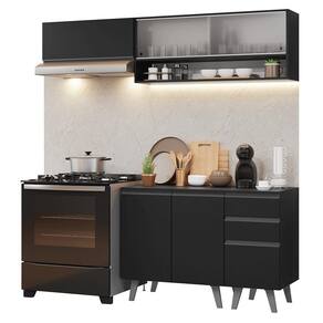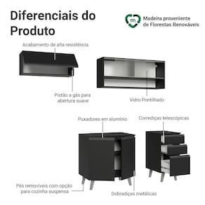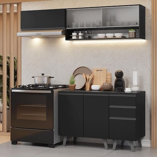O acabamento de alta resistência no tom preto garante um visual moderno e sofisticado à cozinha. Os puxadores em cinza titanium valorizam ainda mais o ambiente,