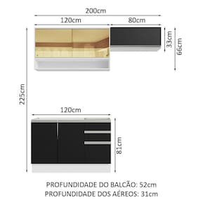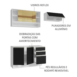 Esse móvel possui puxadores em alumínio, corrediças telescópicas que permitem a abertura total das gavetas e amortecedores para um fechamento suave das portas. Além disso, possui pés reguláveis em PVC e rodapé removível em MDP.