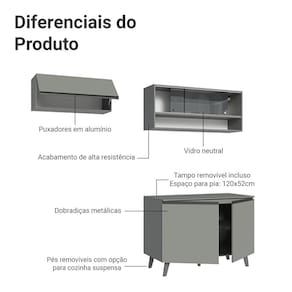 Este modelo conta com dobradiças metálicas nas portas, puxadores em alumínio e vidro no estilo neutral. Todos esses detalhes enobrecem a cozinha, trazendo muito sofisticação e durabilidade.