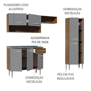 Qualidade duradoura e ótimo custo-benefício: A cozinha possui fabricação com materiais de alta qualidade. Suas corrediças e dobradiças metálicas, puxadores com alumínio e pés reguláveis em PVC garantem maior durabilidade e resistência.
