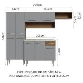 - 44 cm de profundidade no balcão e 27 cm de profundidade no aéreo e no paneleiro