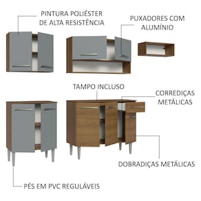 Qualidade duradoura e ótimo custo-benefício: A cozinha possui fabricação com materiais de alta qualidade. Suas corrediças e dobradiças metálicas, puxadores com alumínio e pés reguláveis em PVC garantem maior durabilidade e resistência.