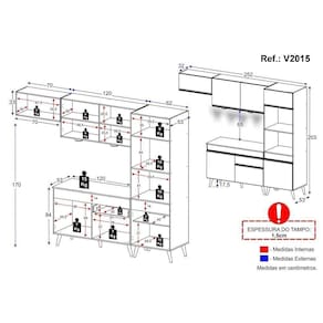 O Armário de Cozinha Compacta 252cm com Leds Veneza Up Multimóveis V2015 tem um excelente custo benefício e um amplo espaço interno. Produzido em MDP com acabamento acetinado (cerca de 20% de brilho), que garante maior durabilidade e resistência, possui corrediças metálicas (mais leveza no manuseio), pés retrô em polipropileno, que deixam o ambiente mais estiloso, puxadores em ABS e tampo em MDP 15mm com pintura de alta resistência. Os módulos são individuais e você pode montar da maneira que se adaptar melhor ao seu ambiente. O balcão possui tampo removível (compatível com pia de 120 cm). Para deixar sua cozinha mais bonita e organizada, possui módulo para forno e microondas, além de compartimento especial para utensílios mais altos. As luminárias em LED, que acompanham a cozinha, proporcionam um visual mais bonito e moderno, deixando o ambiente aconchegante e confortável. Com design minimalista e de fácil instalação, você pode escolher em qual lugar do móvel deseja fixar. Com luz brilhante, as luminárias funcionam com 3 pilhas AAA.Conteúdo da Embalagem:1 (um) armário aéreo 70cm1 (um) armário aéreo 120cm1 (um) balcão com tampo 120cm1 (um) armário para forno e microondas 62cm1 (um) kit com 2 Luminárias LEDDimensões do produto montado:Cozinha - Altura: 203cm | Largura: 252cm | Profundidade: 32cm (aéreos) - 53cm (paneleiro e balcão com tampo)Espaço para fogão/geladeira - Altura: 170cm | Largura: 70cm*Você pode consultar as medidas internas na imagem técnica do produto.*As cores do produto podem sofrer variações de tonalidade de acordo com as configurações do seu dispositivo.Imagem meramente ilustrativa. Decoração e eletros não acompanham o produto.O produto será entregue desmontado e não disponibilizamos o serviço de montagem. Acabamento: Pintura Acetinada Texturizada | Cor: Preto/Dourado | Tonalidade: Preto | Material: MDP | Referência do Modelo: V2015 | Coleção: Veneza Up | Instruções de Cuidado: Limpar com pano seco para retirar o pó. Não utilizar lustra móveis e produtos químicos ou abrasivos à limpeza. | Sistema de Montagem: O produto acompanha manual de montagem e kit ferragem. O produto será entregue desmontado e não disponibilizamos o serviço de montagem. | Produto Composto por: 1 armário aéreo 70 cm, 1 armário aéreo 120 cm, 1 balcão com tampo 120 cm, 1 armário para forno e microondas 62 cm, 1 kit com 2 leds, manual de montagem e kit ferragem. | Altura Montado: 203 | Largura Montado: 252 | Profundidade Montado: 53 | Tamanho (L x A x P): 252 x 203 x 53 | Peso do Produto: 98 | Garantia do Fabricante: 3 | Fabricante: Multimóveis | Requer Montagem: Sim | Quantidade de Portas: 7 | Quantidade de Gavetas: 1 | Quantidade de Prateleiras: 6 | Quantidade de Puxadores: 8 | Quantidade de Pés: 9 | Porta com Vidro: Não | Corrediça: Metálica | Material do Puxador: ABS | Material dos Pés: Polipropileno | Acompanha Pia Inox: Não | Balcão 120 cm compatível para uso de pia: Sim | Tampo Incluso: Sim | Quantidade de Tampos: 1 | Material do Tampo: MDP | Espessura do Tampo: 1.5 | Com Prateleiras: Sim | Produto: Cozinha Compacta | Tipo: Modular | Altura (cm): 203 cm | Largura (cm): 252 cm | Profundidade (cm): 53 cm | Estado de Origem: RS | Produto precisa de Montagem?: Sim, sugerimos a contratação do nosso serviço de montagem (para os CEPs em que o serviço está disponível) ou de algum profissional experiente de sua preferência | Ubicação do móvel: Não aplica | Altura do Produto com Embalagem: 53 | Largura do Produto com Embalagem: 65 | Comprimento do Produto com Embalagem: 188 | Peso do Produto com Embalagem: 98 | Nome do Produto no Fornecedor: Armário de Cozinha Compacta 252cm com Leds Veneza Up Multimóveis V2015 Preto/Dourado | Descrição do Tamanho: (L x A x P): 252 x 203 x 53 cm | Tempo de Garantia: 3 meses | Destaque 1: MDP com acabamento acetinado: maior durabilidade e resistência. | Destaque 2: Balcão com tampo removível. Luminárias em led: sua cozinha mais bonita e moderna. | Destaque 3: Corrediças metálicas (mais leveza no manuseio) e pés retrô em polipropileno: ambiente mais estiloso. | Destaque 4: Tamanho do Produto Montado (L x A x P): 252 x 203 x 53 cm | Destaque 5: Os módulos são individuais e você pode montar da maneira que se adaptar melhor ao seu ambiente. Garantia de 90 dias contra defeitos de fabricação. | Marca: Multimóveis | Acessórios incluídos: N/A Cor: Preto/Dourado